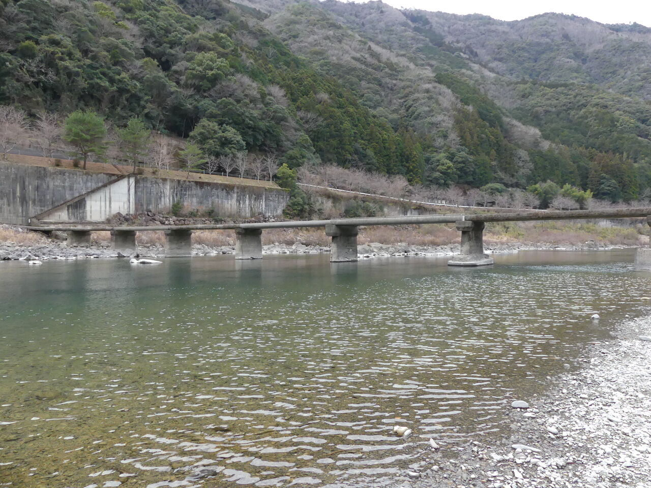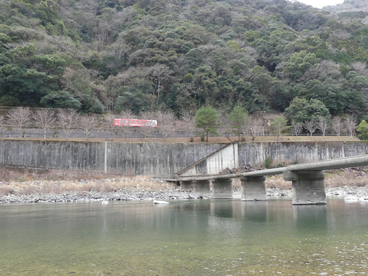 「道の駅・西土佐」を発車した[しまんと開運号]は、次の目的地である長生(ながおいの)沈下橋に向かいます。どうやらここでは四万十川に入って「禊(みそぎ)」をやる…というのが本来の目的だったようですが、さすがに寒くて1人が足まで水に入っただけでした。