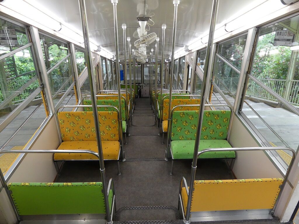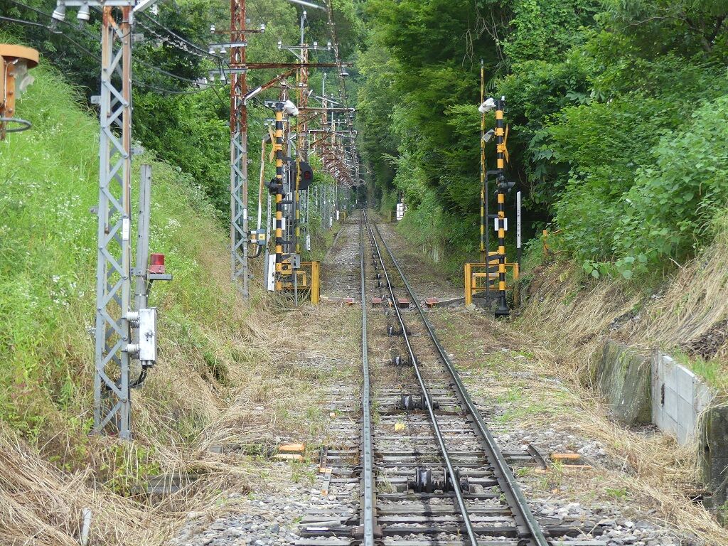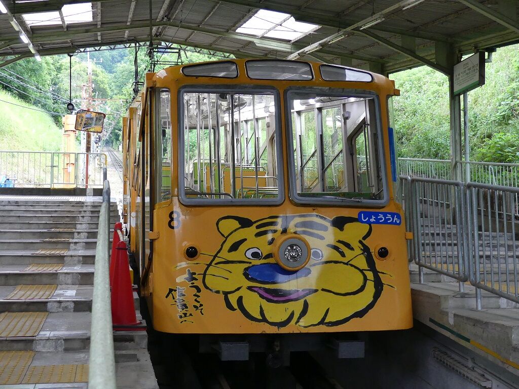 定刻となり、信貴山口駅を発車したケーブルカーは、その珍しい踏切を渡って山頂を目指して進んで行きます。途中のケーブルカー交換所で、もう1台のケーブルカー・ずいうんと交換を行い、480パーミルの急勾配を一気に山を登ると終点の高安山に到着しました。