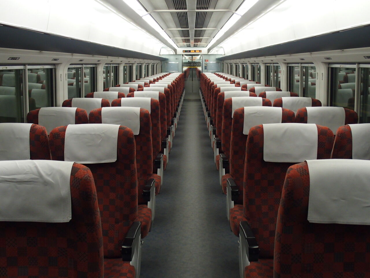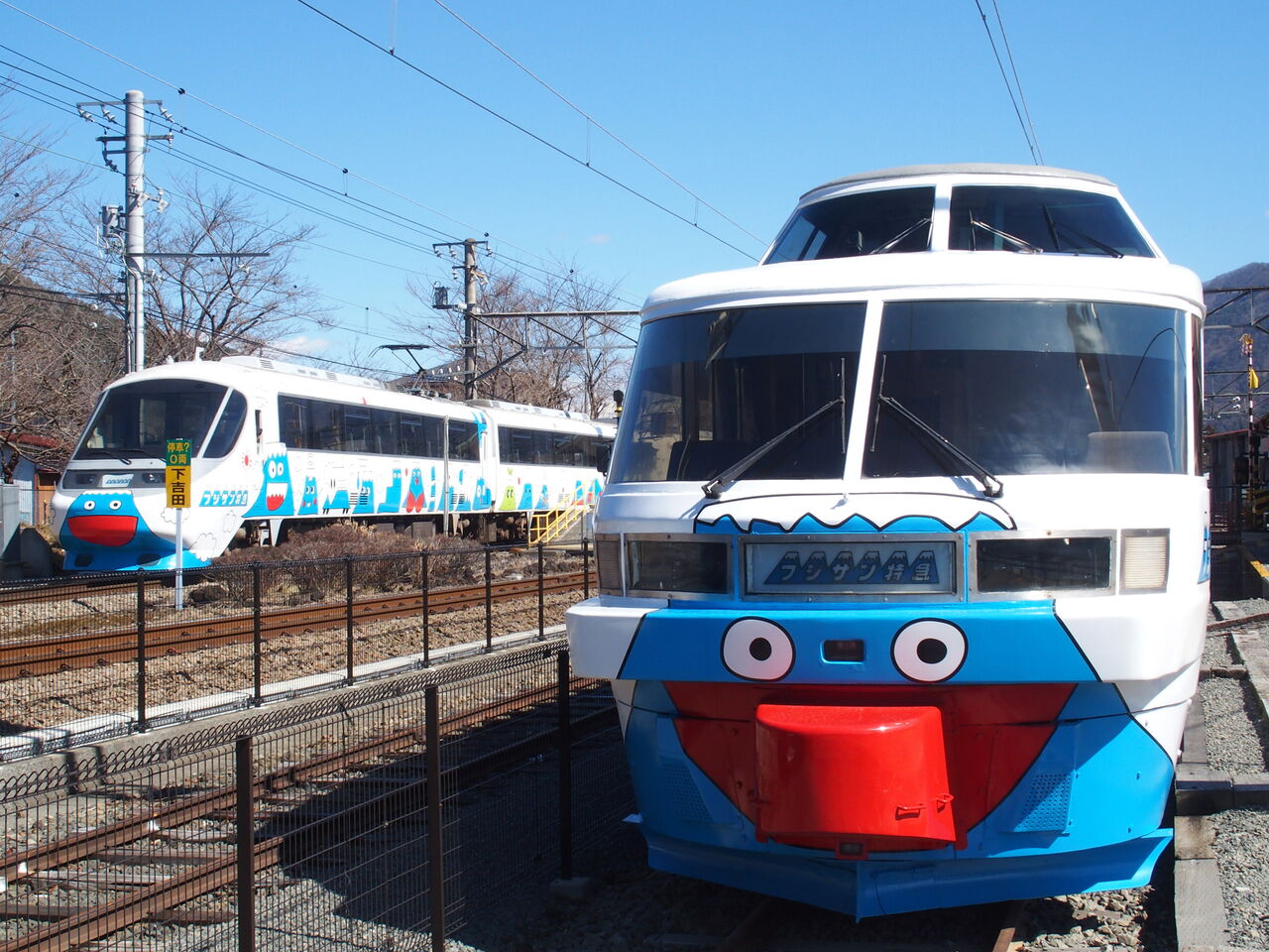 さて、これから乗車するフジサン特急ですが、富士急行では8000系と呼ばれていますが、元を正せは小田急のロマンスカー20000形RSEで、これを富士急行向けに3両に短縮改造した車両です。外観はフジサンのキャラクター達が描かれてだいぶイメージが異なりますが、車内に入るとRSE時代のシートがそのまま並んでおり、まさしくRSEということがわかるかと思います(1号車は富士急行導入時に、運転席後方に展望席を設けていますので、2・3号車の方がロマンスカーの雰囲気が残っています。)。