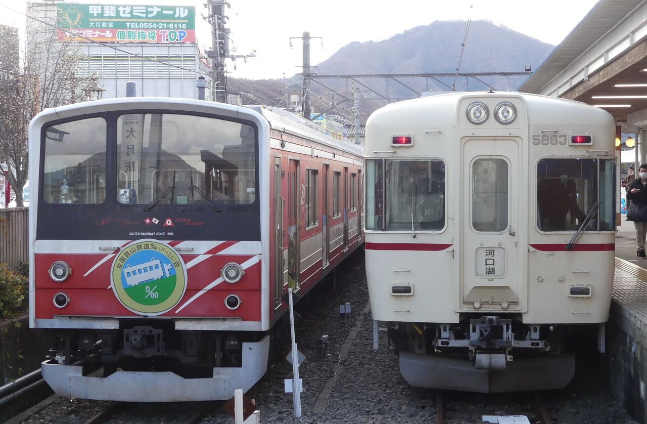 PHOTO:大月駅に停車中の[富士急行線開業90周年記念号]編成