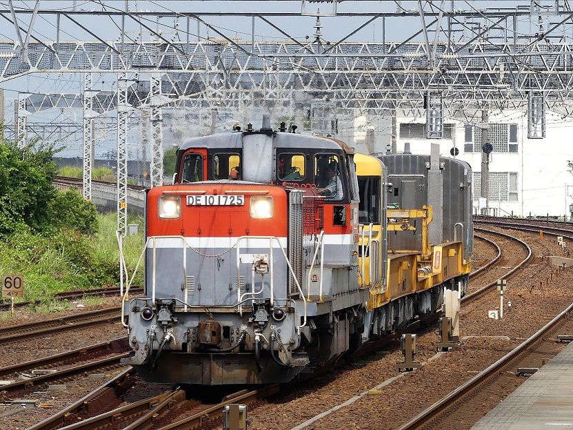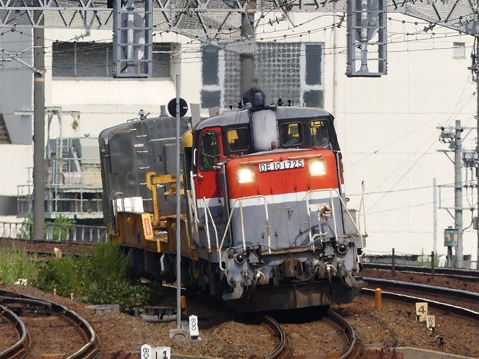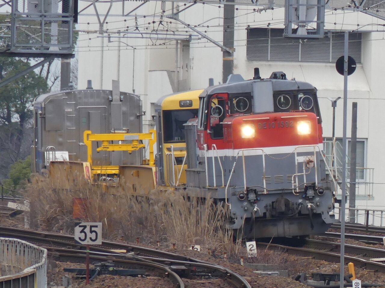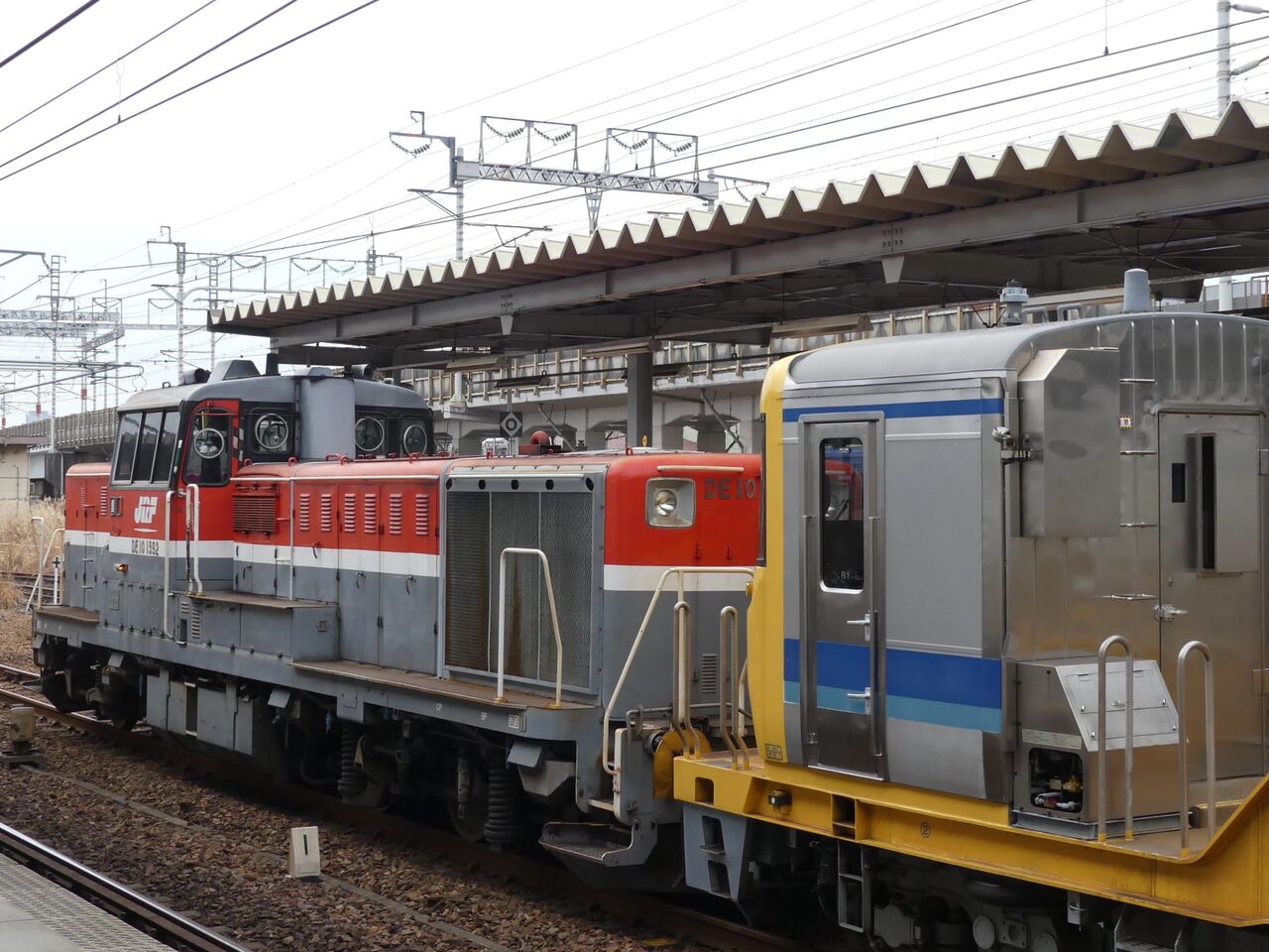 名古屋の街中を走るため、なかなか良い撮影ポイントが無く、ようやく見つけた場所で待っているとDE10が何かを牽引してやってきました!